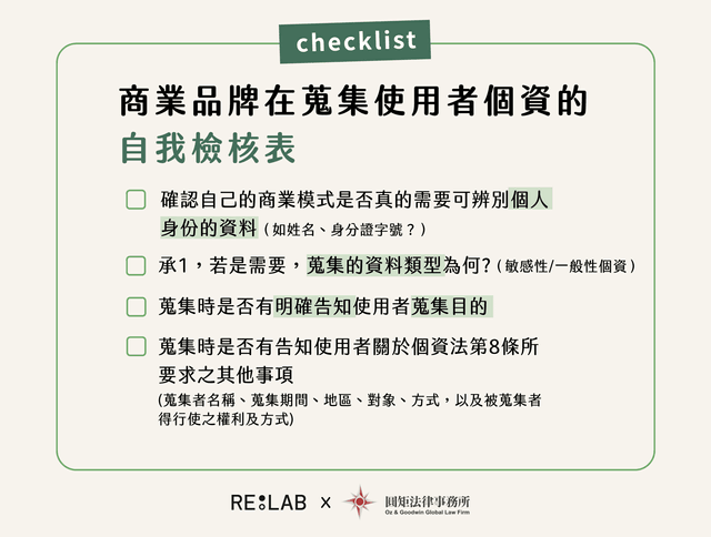 因此,品牌在蒐集使用者資料可以針對以下事項做個自我檢視,並在隱私政策(條款)上做相對應的調整,以免觸犯個資法,承擔不必要的法律以及公關風險: